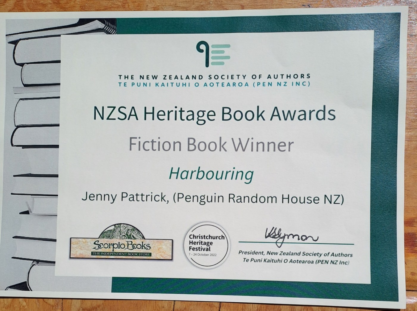 This seems to be the season for writers’ festivals. I’m just back from a lovely day at Featherston, speaking to a lively group there. And just before that was in Christchurch, receiving the NZSA Heritage Literary Award for Fiction! Harbouring won which was a thrill for me.